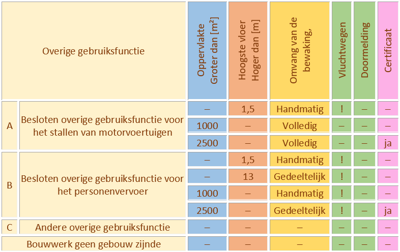 De gebruiksfunctie van parkeergarages is “overige gebruiksfunctie; Besloten gebruiksfunctie voor stallen motorvoertuigen”. Voor parkeergarages gelden strenge eisen t.a.v. de brandveiligheid. Afhankelijk van de grootte is een Brandmeldinstallatie en Ontruimingsalarminstallatie verplicht, maar u moet ook denken aan sturingen.